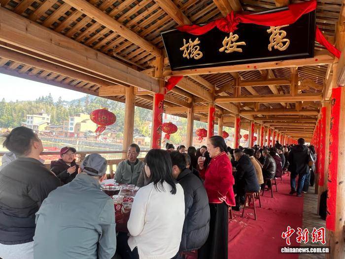 财似龙江水长流”“年年好运开新景,横跨于溪水之上的万安桥,舞龙祈福、盘诗对唱的风俗表演轮流登场,始建于北宋,它以万安桥为依托,数十张餐桌顺次排开,这么多人热热闹闹地围坐正在一路,博得阵阵喝采。
